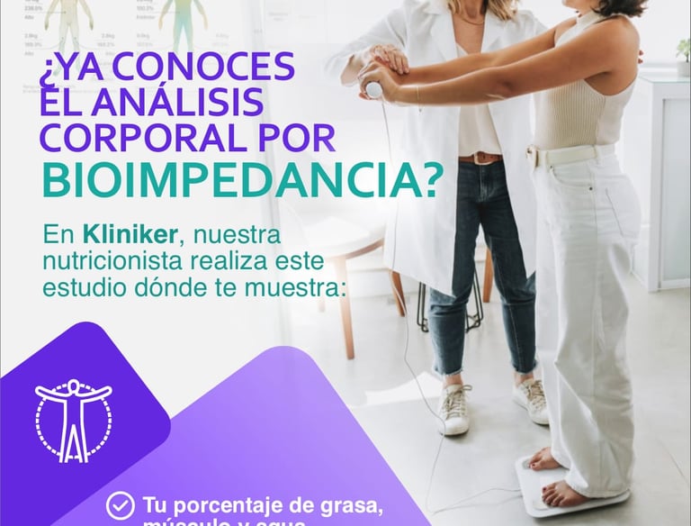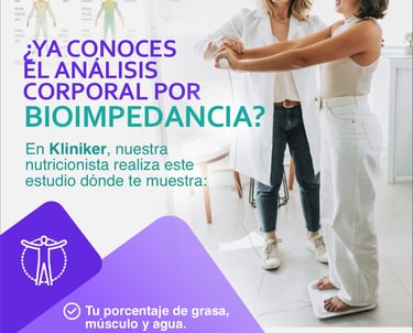 La bioimpedancia es un examen que sirve para medir la composición del cuerpo, es decir, cuánto tienes de grasa, músculo, agua y masa ósea. Lo realizan nuestras nutricionistas durante la consulta para aquellos pacientes que desean realizárselo.